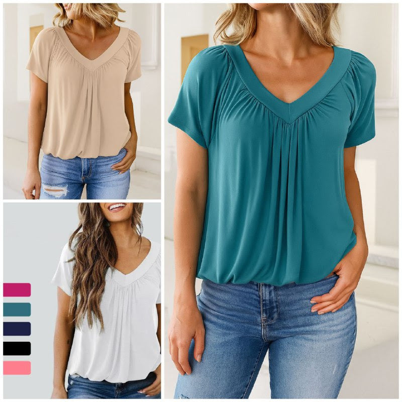 Le Top Légende incarne cette élégance discrète que l’on enfile le matin sans hésiter. Son col en V structuré, subtilement froncé sur la poitrine, allonge la silhouette tout en apportant un jeu de volume maîtrisé. Sa coupe fluide épouse le corps avec justesse, sans jamais le contraindre — pour un tombé naturellement flatteur, du matin jusqu’au soir.